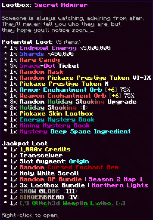 This week we are introducing a the new Lootbox: Secret Admirer alongside of course a 3x Lootbox Bundle & updated Space-Bot Loot table.