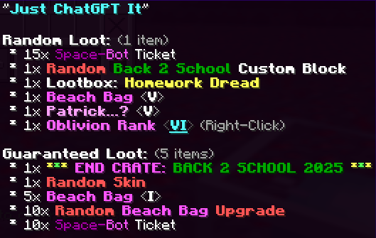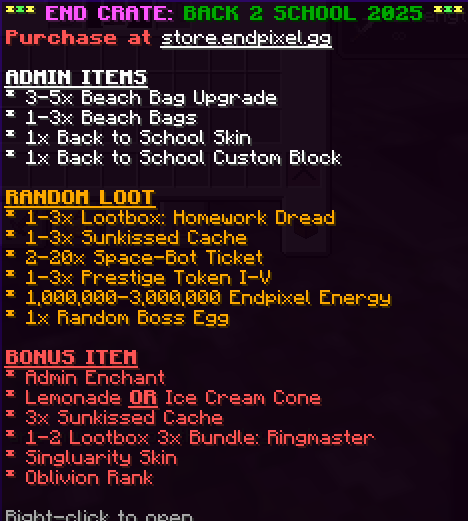 - 1x EndCrate: "Back 2 School 2025"